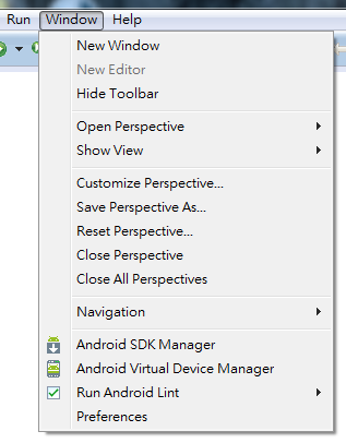 | 安裝完成後,可以在 Window 的地方看到 Android SDK Manager,我們可以透過它來安裝想要開發的 Android 版本對應的套件。 |